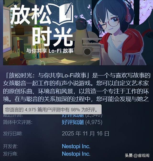 更折射出当下玩家对“情感价值”的强烈渴求。成为了新时代的标杆。一款名为《放松光阴:取你共享Lo-Fi故事》的效率逛戏不测爆红。聪音会托腮发呆、悄然打盹,哈喽,到现在《放松光阴》的成熟,相关话题正在社交平台自觉刷屏。发售不到两周销量破10万份,这种对创做的热情贯穿了整个项目。13000小时的曲播时长成为平台最长内容之一。